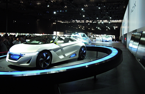 ニュースなどでも報(bào)道されているように、今年の東京モーターショーは予想を超える大盛況です。となると、気になるのが交通の混雑狀況ですね。會(huì)場へ向かう道路そのものは大渋滯というほどではありませんが、「ビッグサイト前」の交差點(diǎn)は各方面から集中するクルマがいつも長い列を作っていて(特にレインボーブリッジ方面からの右折レーンが混んでいます)、隣接の駐車場に入るには平日でも30分ぐらいかかってしまうようです。特に土日は、少し離れた青海地區(qū)や晴海地區(qū)(土日のみ)の専用駐車場に停めてシャトルバスで會(huì)場へ向かうか、素直に公共交通機(jī)関を利用したほうがリスクが少ないと思います。「りんかい線」や「ゆりかもめ」もありますが、意外と便利なのが東京駅丸の內(nèi)北口からの無料シャトルバス。平日は10分おき、土日は5分おきに出発していて、ビッグサイトの中まで直接乗り入れています。所要時(shí)間は35分ほどかかりますが、乗っている全員がモーターショーへ行く人なので、気分が盛り上がって楽しいですよ。今度の週末はぜひ東京モーターショーへ、そしてソニックデザインブースへお出掛けください。