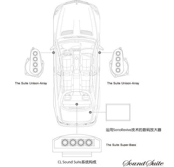 無(wú)論是音質(zhì)音域的調(diào)整還是電力增幅,都可以進(jìn)行嚴(yán)格控制的數(shù)字放大器●將原裝音響的聲音高品質(zhì)重現(xiàn)的SonoRevive技術(shù)●由兩組共四個(gè)口徑只有52毫米的全頻驅(qū)動(dòng)器SD-N52N組成的無(wú)縫高精度鋁壓鑄全頻驅(qū)動(dòng)器「The Suite Unison-Array」●裝有專用端口調(diào)節(jié)器、由一組共兩個(gè)頂級(jí)微型揚(yáng)聲器組合「SD-N77N」組成的雙重高精度鋁壓鑄可添加式揚(yáng)聲系統(tǒng)「The Suite Extend-Woofer」●根據(jù)乘客的有無(wú)而進(jìn)行的音域和音質(zhì)的調(diào)節(jié)、和根據(jù)車門的開關(guān)和與倒車檔聯(lián)動(dòng)的而對(duì)音響開關(guān)進(jìn)行操作的全自動(dòng)化控制