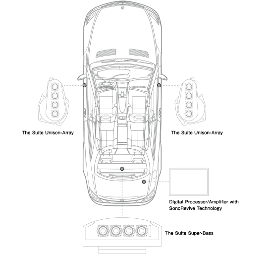 論是音質(zhì)音域的調(diào)整還是電力增幅,都可以進(jìn)行嚴(yán)格控制的數(shù)碼放大器●將原裝音響的聲音高品質(zhì)重現(xiàn)的SonoRevive技術(shù)●由兩組共四個(gè)口徑只有52毫米的寬波段驅(qū)動(dòng)器SD-N52N組成的無(wú)縫高精度鋁壓鑄全頻驅(qū)動(dòng)器「The Suite Unison-Array」●裝有專用端口調(diào)節(jié)器、由一組共兩個(gè)頂級(jí)微型揚(yáng)聲器單元「SD-N77N」組成的雙重高精度鋁壓鑄可添加式揚(yáng)聲系統(tǒng)「The Suite Extend-Woofer」●根據(jù)乘客的有無(wú)而進(jìn)行的音域和音質(zhì)的調(diào)節(jié)、和根據(jù)車門的開(kāi)關(guān)和與倒車檔聯(lián)動(dòng)的而對(duì)音響開(kāi)關(guān)進(jìn)行操作的全自動(dòng)化控制