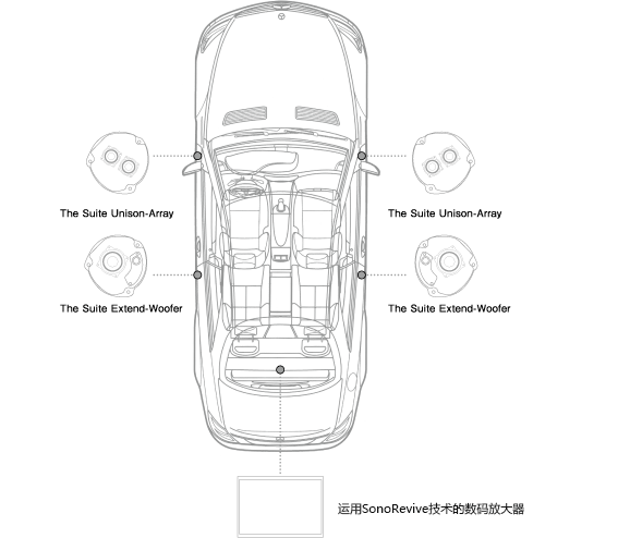 無論是音質音域的調整還是電力增幅,都可以進行嚴格控制的數(shù)字放大器●將原裝音響的聲音高品質重現(xiàn)的SonoRevive技術●由兩組共四個口徑只有52毫米的寬頻驅動器SD-N52N組成的無縫高精度鋁壓鑄全頻驅動器「The Suite Unison-Array」●裝有專用端口調節(jié)器、由一組共兩個頂級微型揚聲器單元「SD-N77N」組成的雙重高精度鋁壓鑄可添加式揚聲系統(tǒng)「The Suite Extend-Woofer」●根據(jù)乘客的有無而進行的音域和音質的調節(jié)、和根據(jù)車門的開關和與倒車檔聯(lián)動的而對音響開關進行操作的全自動化控制