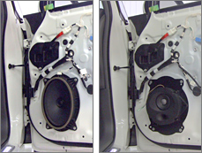 ●フロントドアに裝著したエンクロージュア一體型ウーファー(寫(xiě)真右)。不快な共振を抑えたクリアな中低音です。