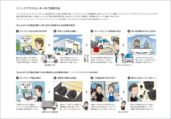 SonicPLUSをご自身で取り付けたり、お知り合いのショップなどに取り付けを依頼されるお客様のために、「ソニックプラスセンター新潟」のオンラインショップではSonicPLUS製品のみをご購入いただくこともできます。オンラインショップで販売されたSonicPLUS製品には、製品の取り付けや使い方に関する基本的なご質(zhì)問にお答えする販売後90日間のユーザーサポート(電話またはメール)を無償でお付けいたします。